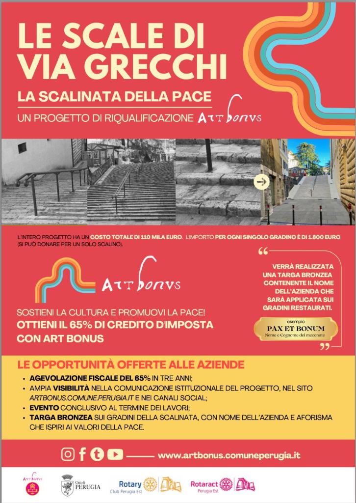 La scalinata dell’odierna Via Mario Grecchi rappresenta anche uno dei simboli degli ideali pacifisti della città di Perugia. Mario Grecchi fu, infatti, un partigiano antifascista che operò nell’area dei monti Bettona, Deruta e Collemancio e che trovò la morte a Perugia il 17 marzo 1944. Il progetto Art Bonus Perugia relativo a questo restauro è noto proprio per questo con la denominazione: “La Scalinata della Pace”.